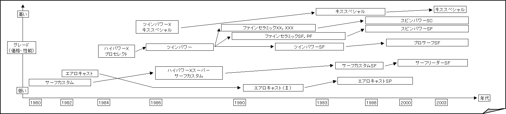 も頻繁です。同一銘柄でモデルチェンジを重ねる度に熟成を進める手法はリョービのプロスカイヤーシリーズ |